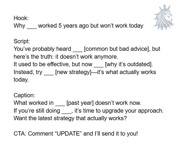 “What worked 5 years ago won’t work now.” This positions you as the expert who stays ahead of trends.