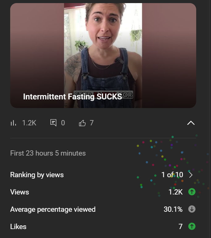 Dr. Britnei Artz, creator of Dr. B: Your Other Doctor, posted a Short titled “Intermittent Fasting SUCKS.” In under 24 hours, it ranked #1 out of her last 10 videos with 1.2K views and sparked dozens of new comments and subscribers.